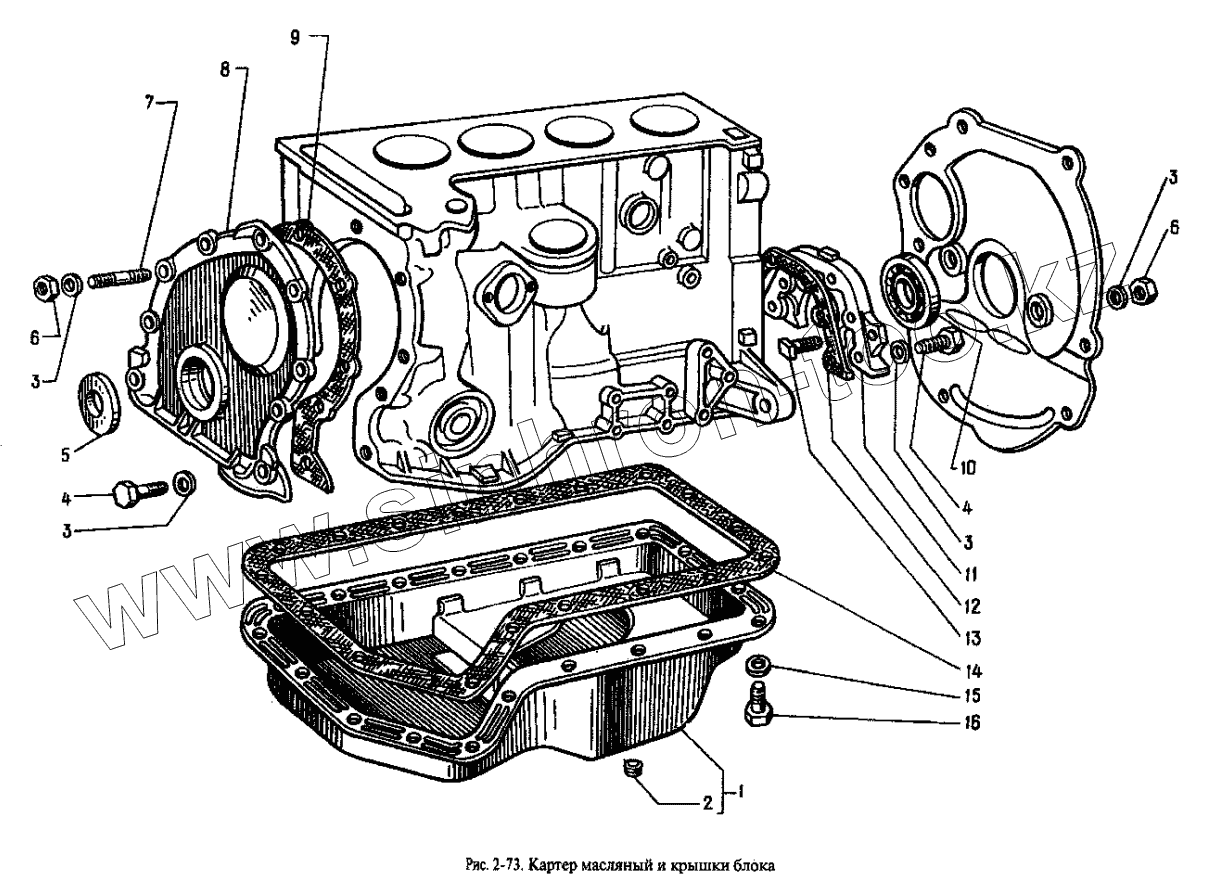 Каталог запасных частей к технике: АЗЛК Москвич-2335. Картер масляный и крышки блока