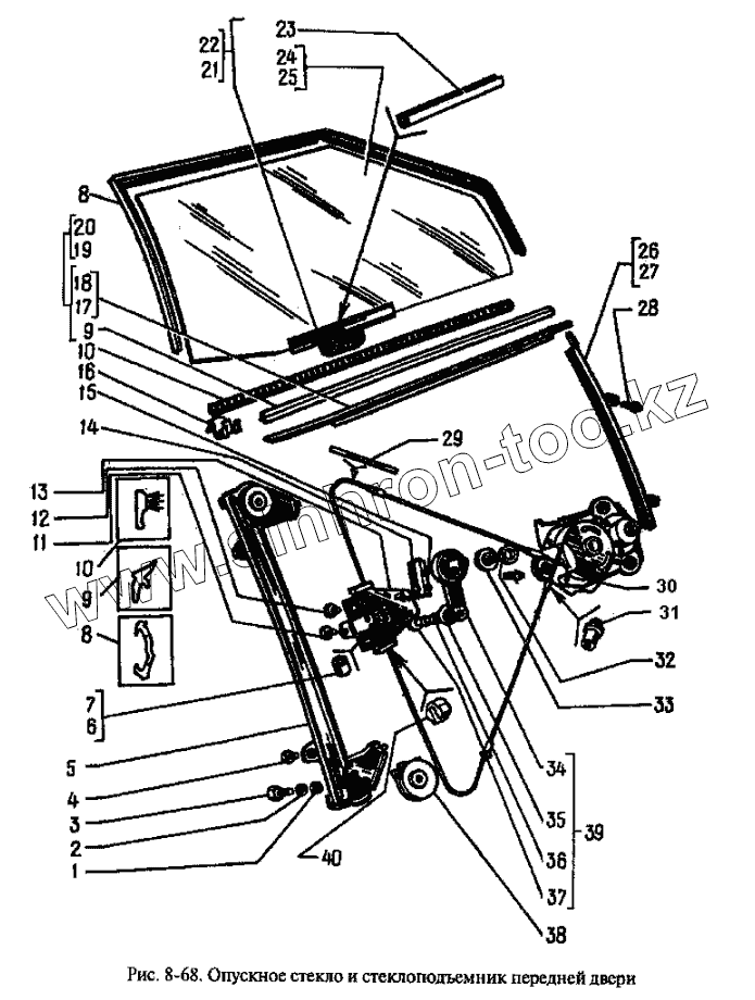 Каталог запасных частей к технике: АЗЛК Москвич-2335. Опускное стекло и стеклоподъемник передней двери