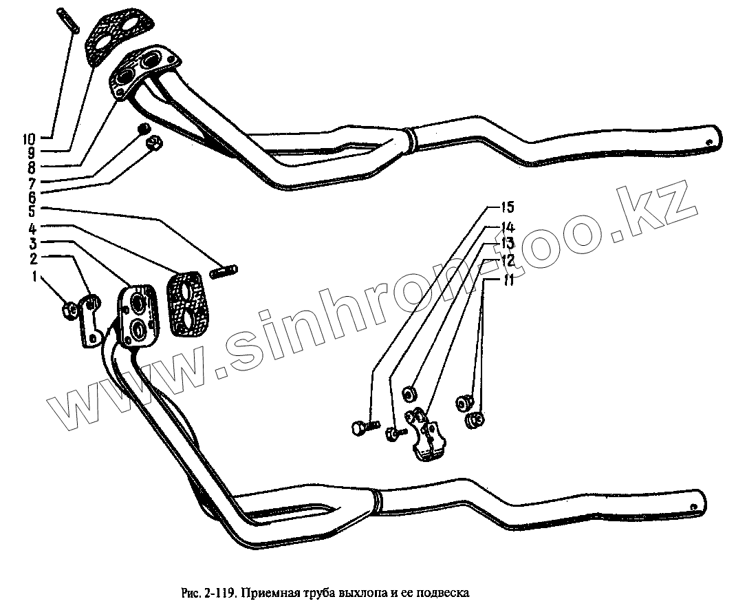 Каталог запасных частей к технике: АЗЛК Москвич-2335. Приемная труба выхлопа и ее подвеска