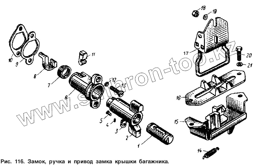 Каталог запасных частей к технике: АЗЛК Москвич-2734. Замок, ручка и привод замка крышки багажника
