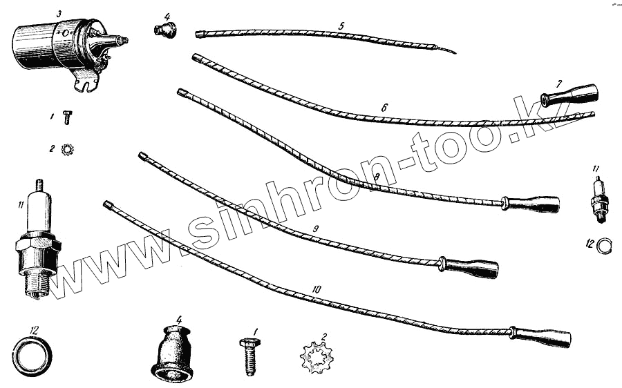 Каталог запасных частей к технике: АЗЛК Москвич-407. Катушка зажигания, свеча и провода зажигания