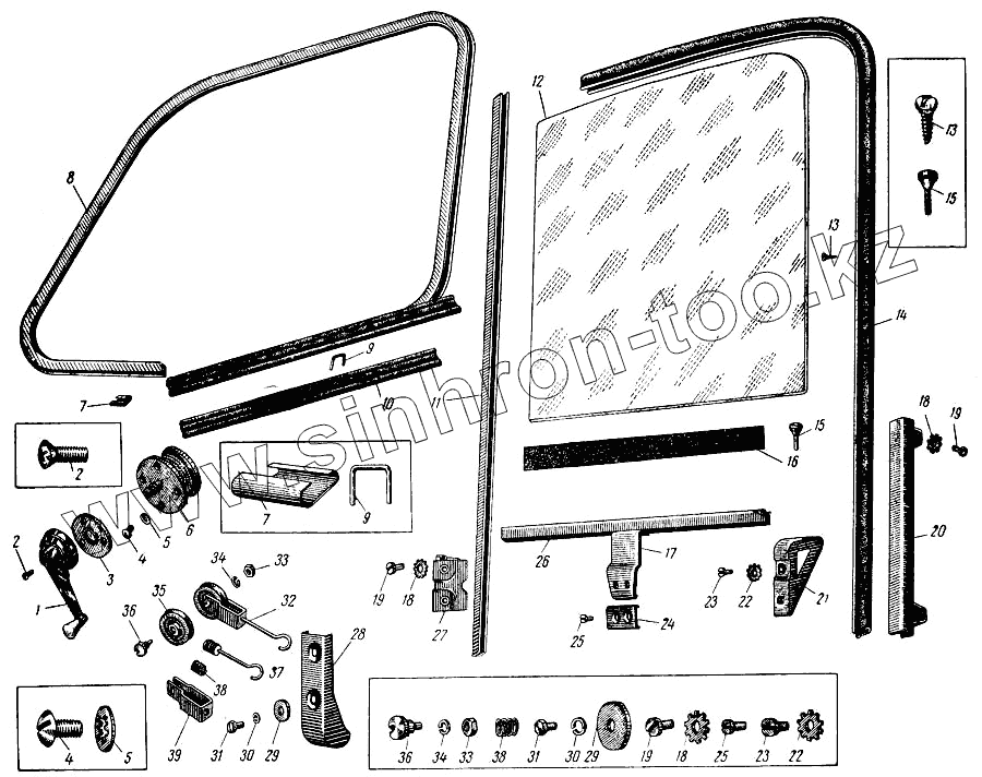 Каталог запасных частей к технике: АЗЛК Москвич-407. Опускное стекло и стеклоподъемник передней двери