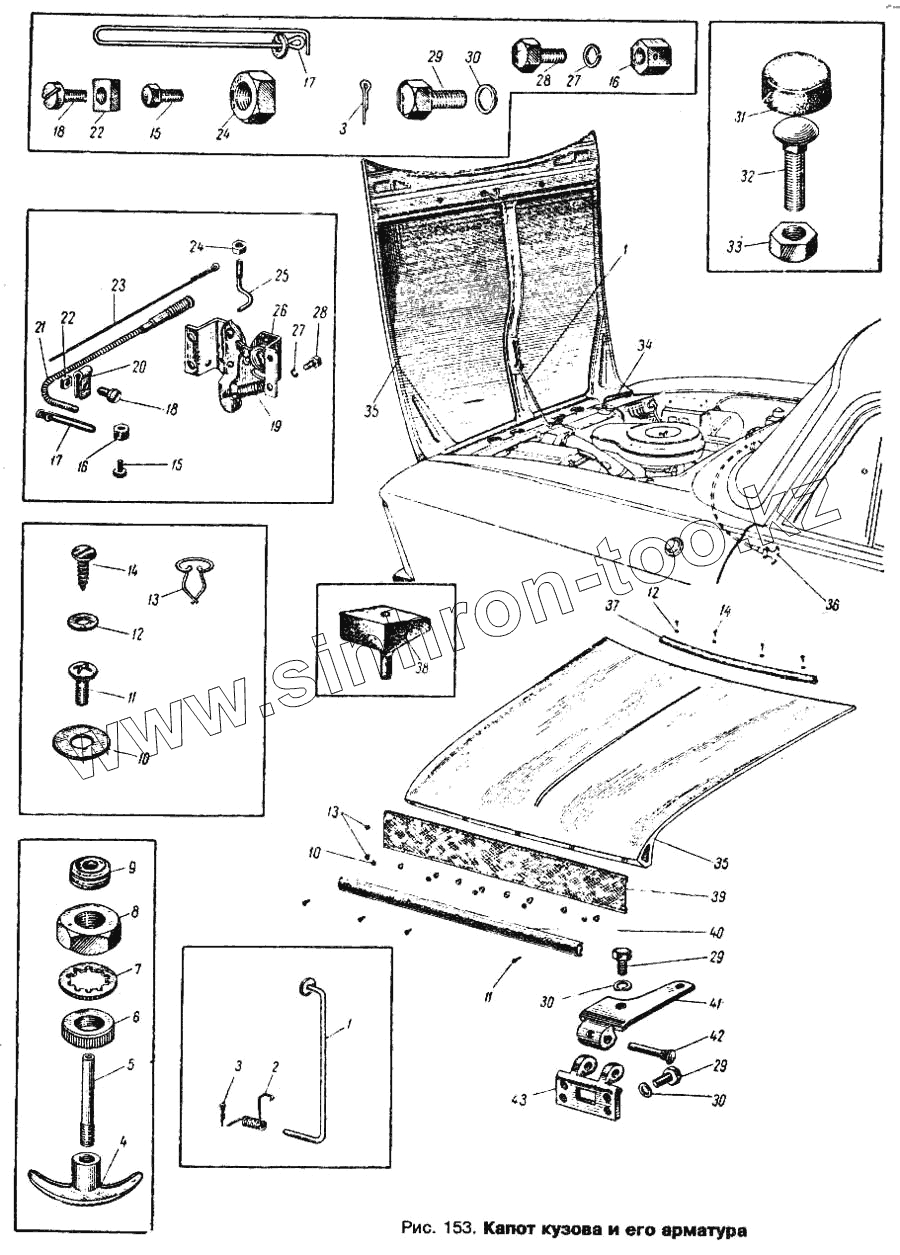 Каталог запасных частей к технике: АЗЛК Москвич 412. Капот кузова и его арматура