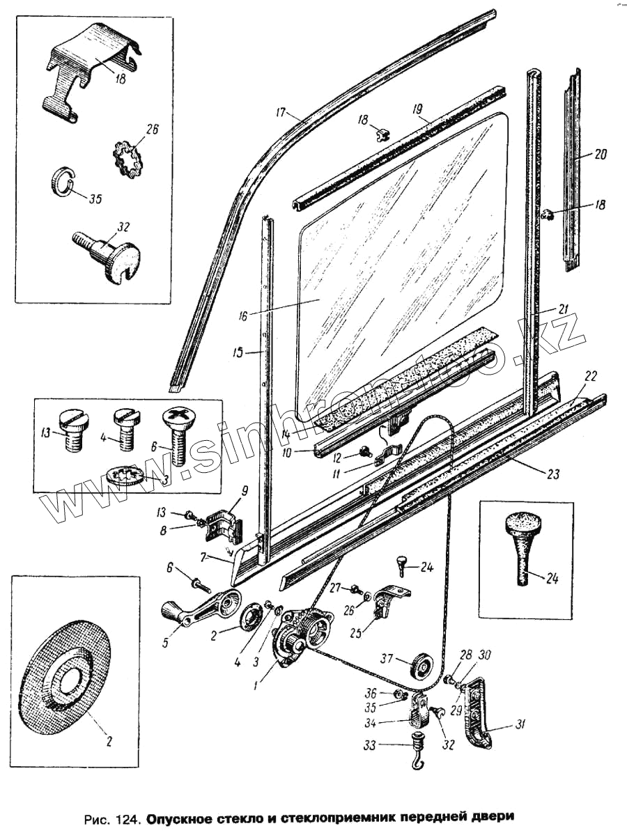 Каталог запасных частей к технике: АЗЛК Москвич 412. Опускное стекло и стеклоподъемник передней двери