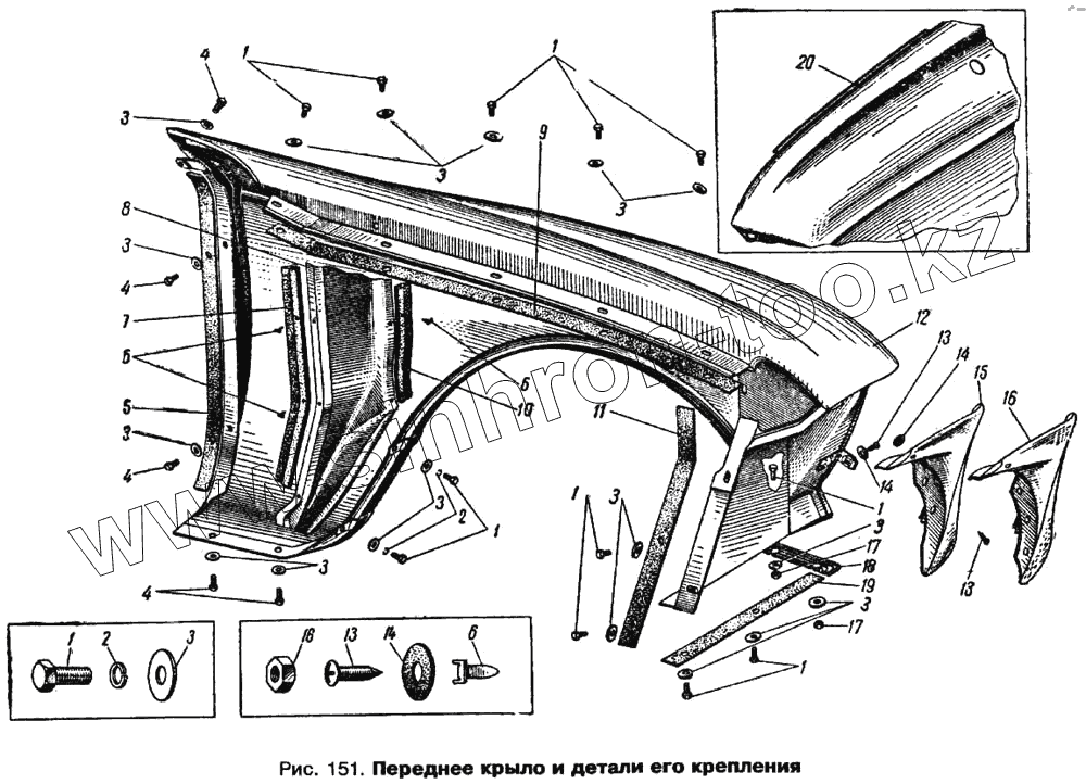 Каталог запасных частей к технике: АЗЛК Москвич 412. Переднее крыло и детали его крепления