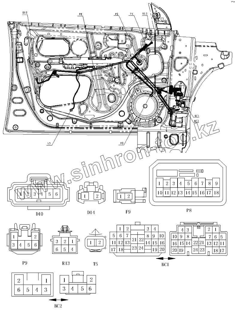 Каталог запасных частей к технике: BYD F3. Электрооборудование левой передней двери - разъемы