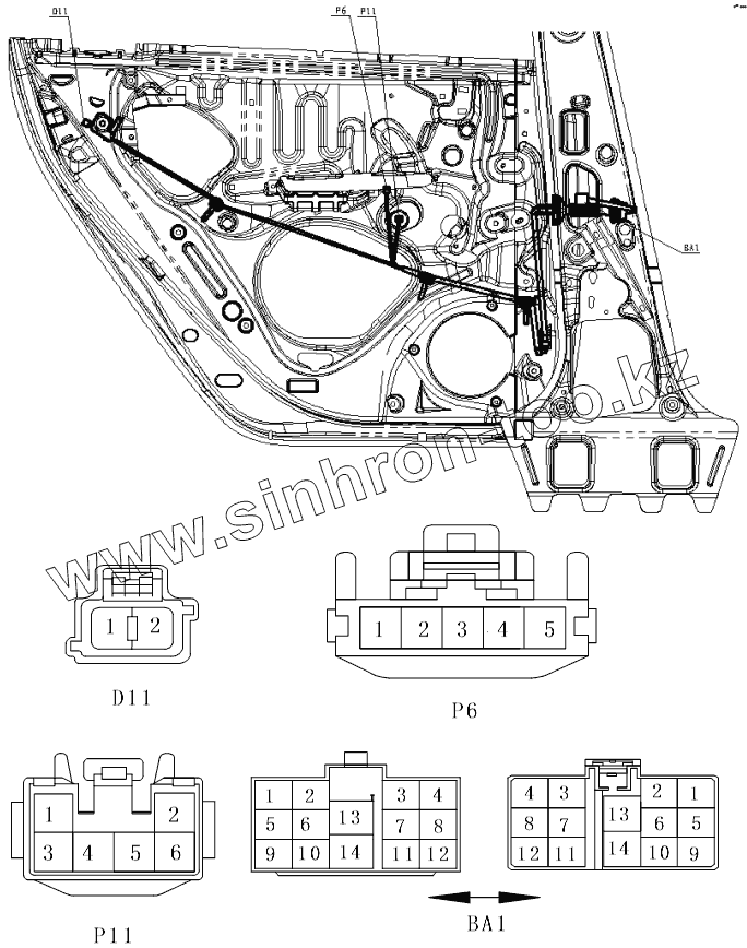 Каталог запасных частей к технике: BYD F3. Электрооборудование задней левой двери - разъемы