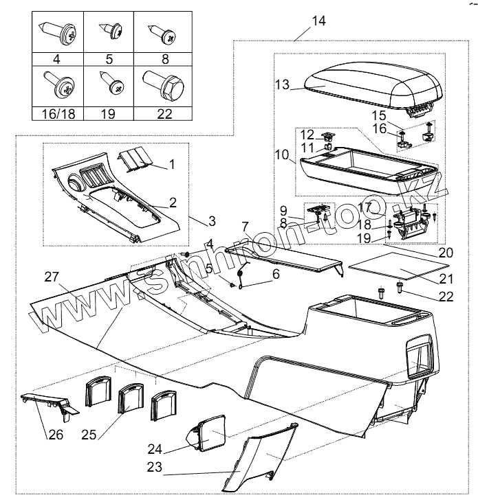 | 19 | Q2204816 | Монтажный винт нижнего откидного шарнирного механизма центрального вещевого ящика в сборе | |