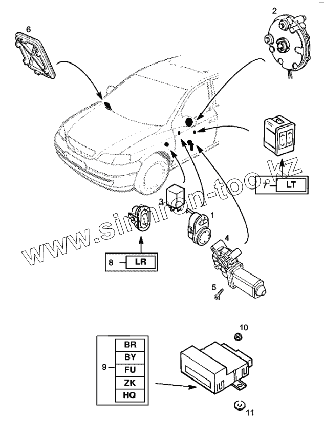 Электродвигатель, регулятор окна, передняя дверь, левая сторона