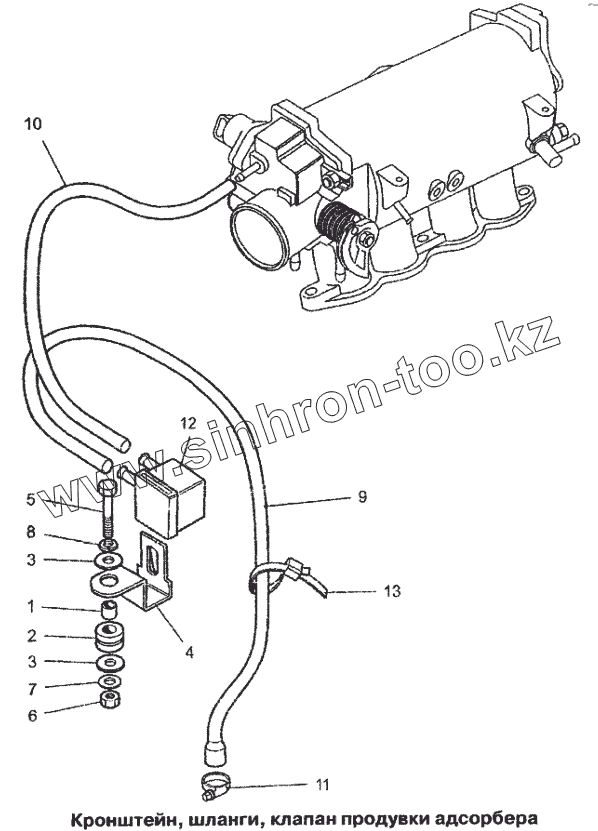 Каталог запасных частей к технике: Daewoo Lanos. Кронштейн, шланги, клапан продувки