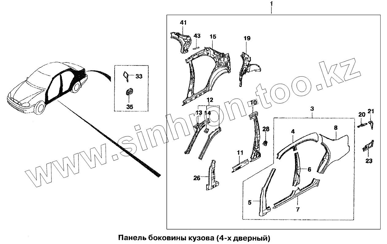 Каталог запасных частей к технике: Daewoo Lanos. Панель боковины кузова (4-х дверный)