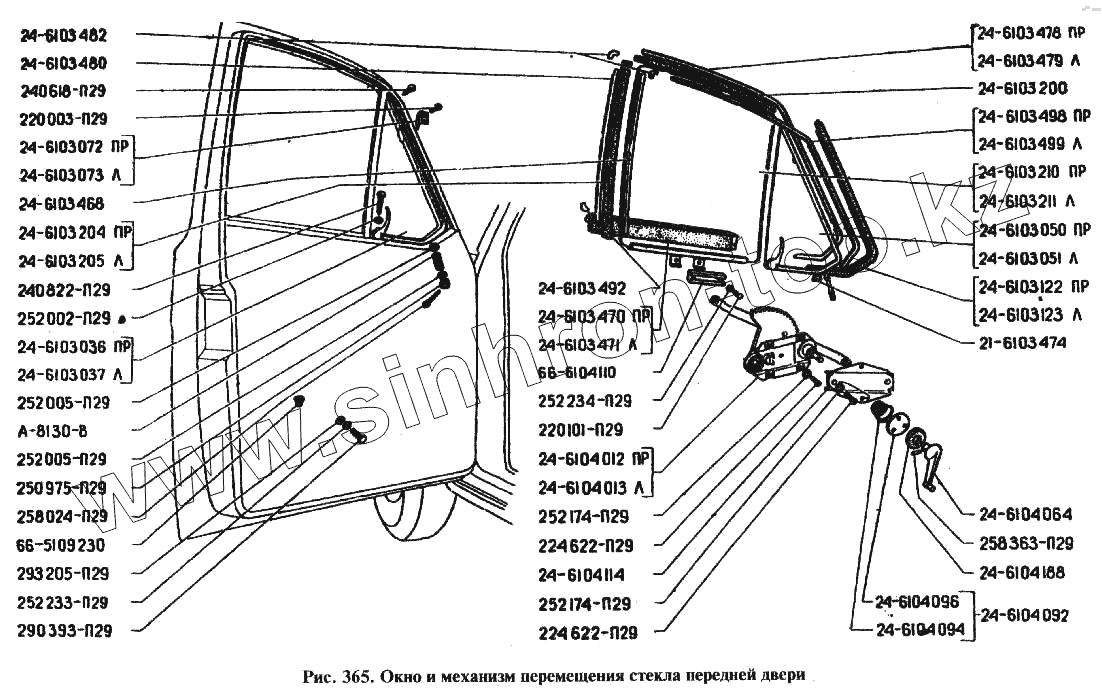 Каталог запасных частей к технике: ГАЗ-24. Окно и механизм перемещения стекла передней двери