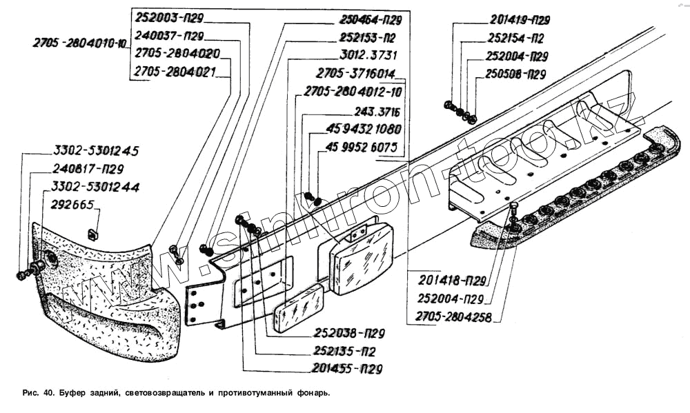 Каталог запасных частей к технике: ГАЗ-2705 (ГАЗель). Буфер задний, световозвращатель и противотуманный фонарь