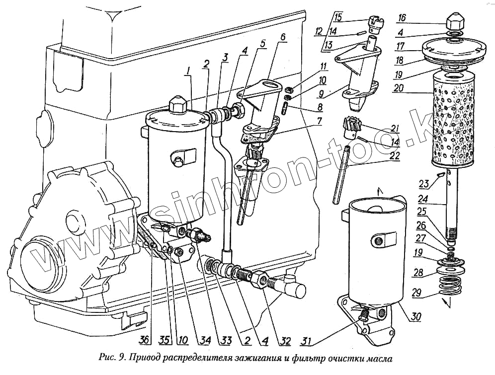 Каталог запасных частей к технике: ГАЗ-31029. Привод распределителя зажигания и фильтр очистки масла