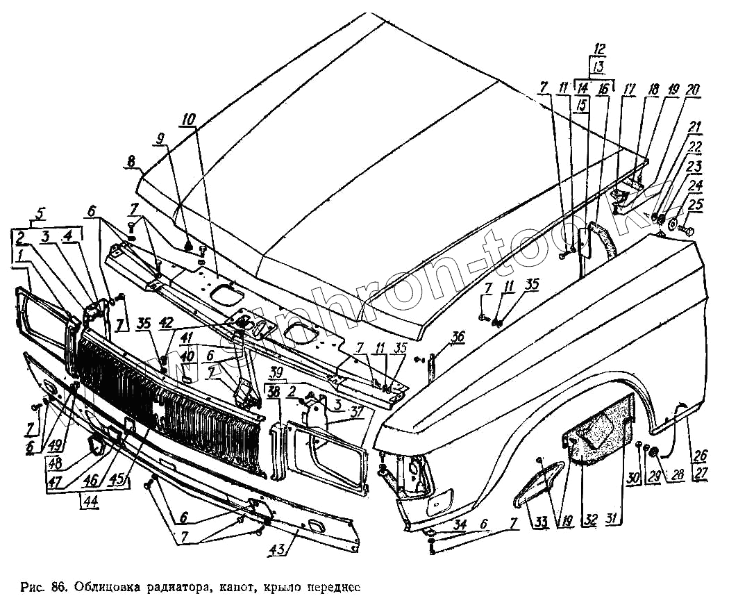 Каталог запасных частей к технике: ГАЗ-3102. Облицовка радиатора, капот, крыло переднее