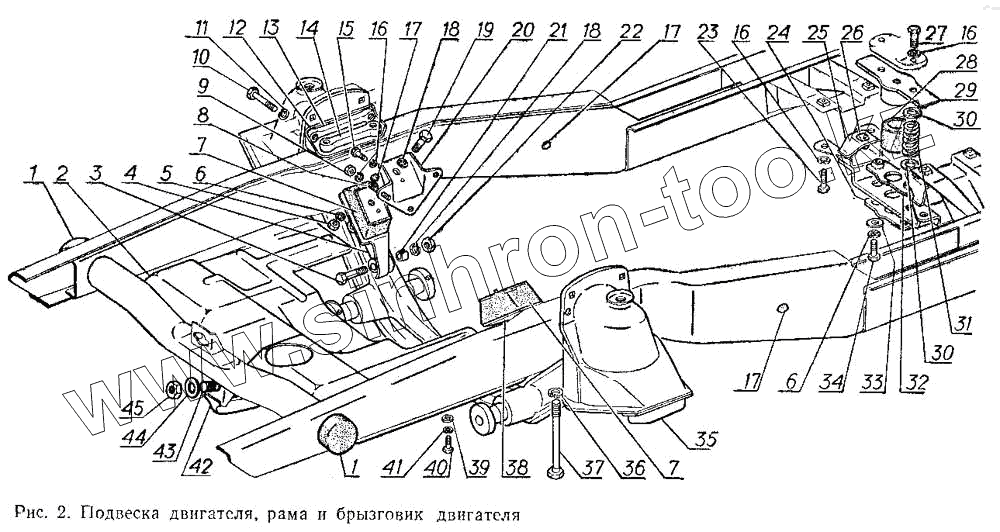 Каталог запасных частей к технике: ГАЗ-3102. Подвеска двигателя, рама и брызговик двигателя