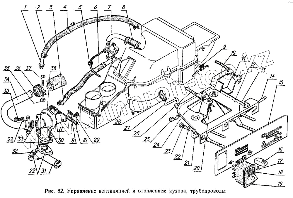 Каталог запасных частей к технике: ГАЗ-3102. Управление вентиляцией и отоплением кузова, трубопроводы