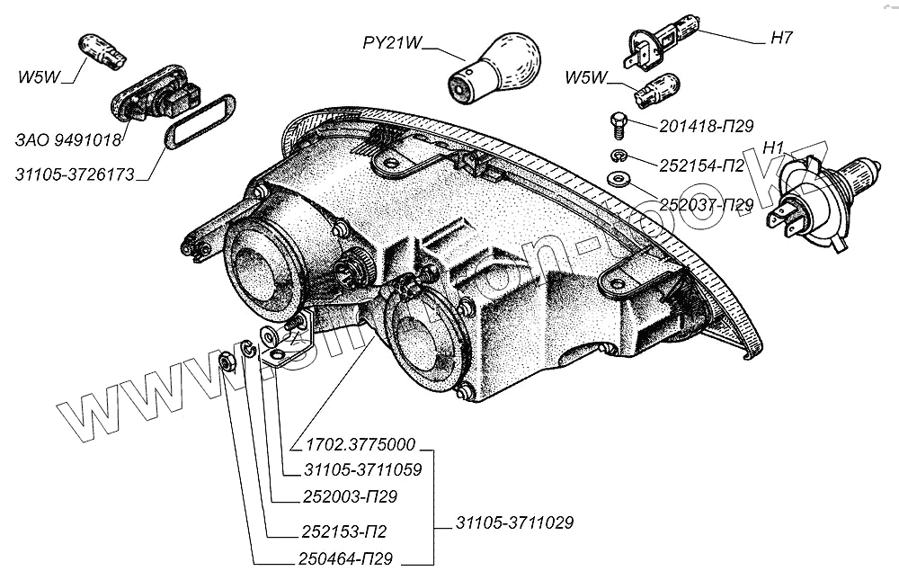 Каталог запасных частей к технике: ГАЗ-31105. Фары, боковой указатель поворота