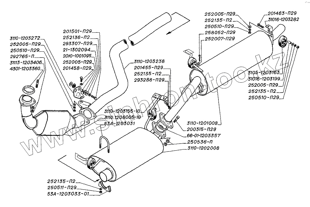 Каталог запасных частей к технике: ГАЗ-31105. Установка системы выпуска газов