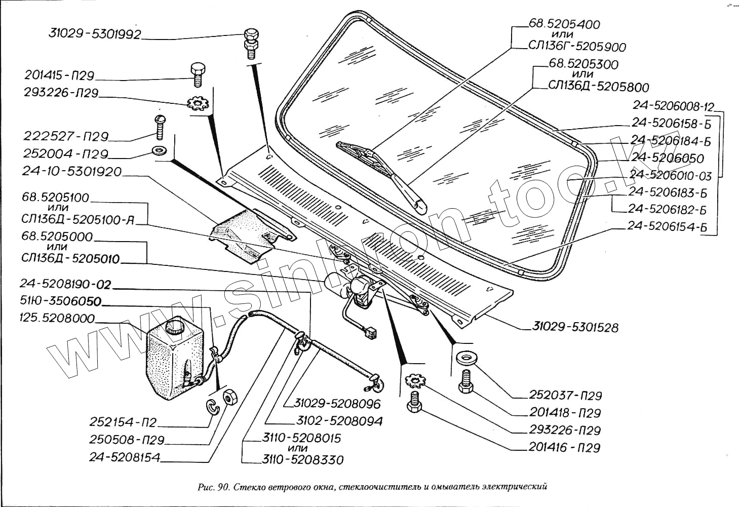 Каталог запасных частей к технике: ГАЗ-3110. Стекло ветрового окна, стеклоочиститель и омыватель электрический