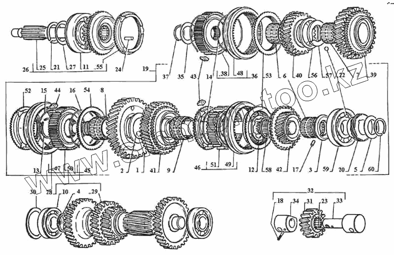 | 32 | 31029-1701088 | Ось со втулкой и промежуточной шестерней заднего хода | |