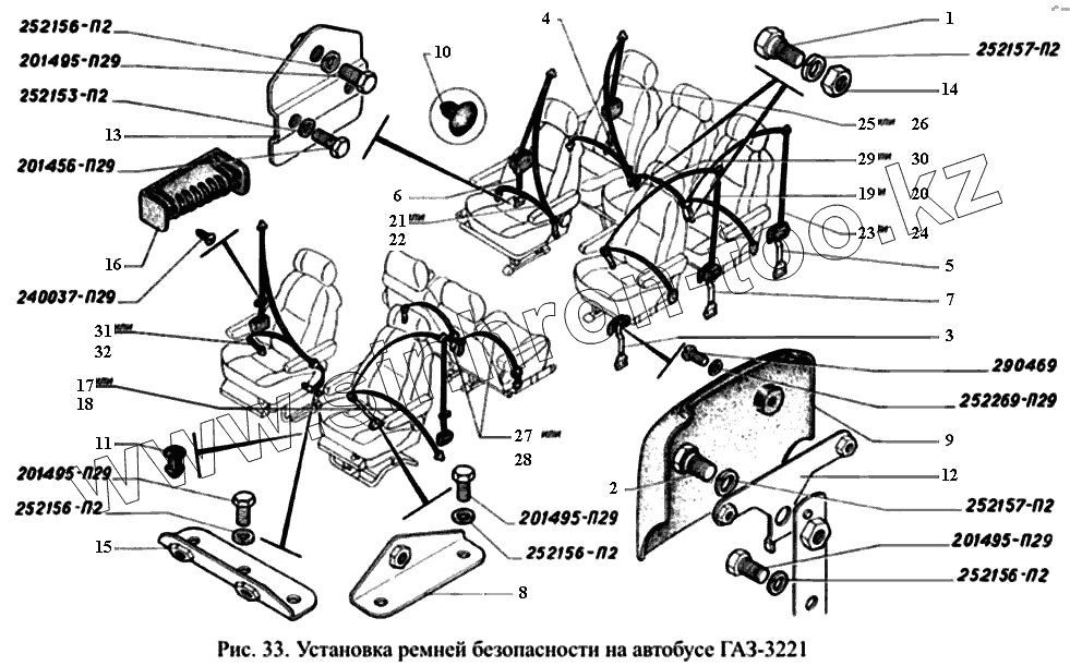 Каталог запасных частей к технике: ГАЗ-3221. Установка ремней безопасности на автобусе ГАЗ-3221