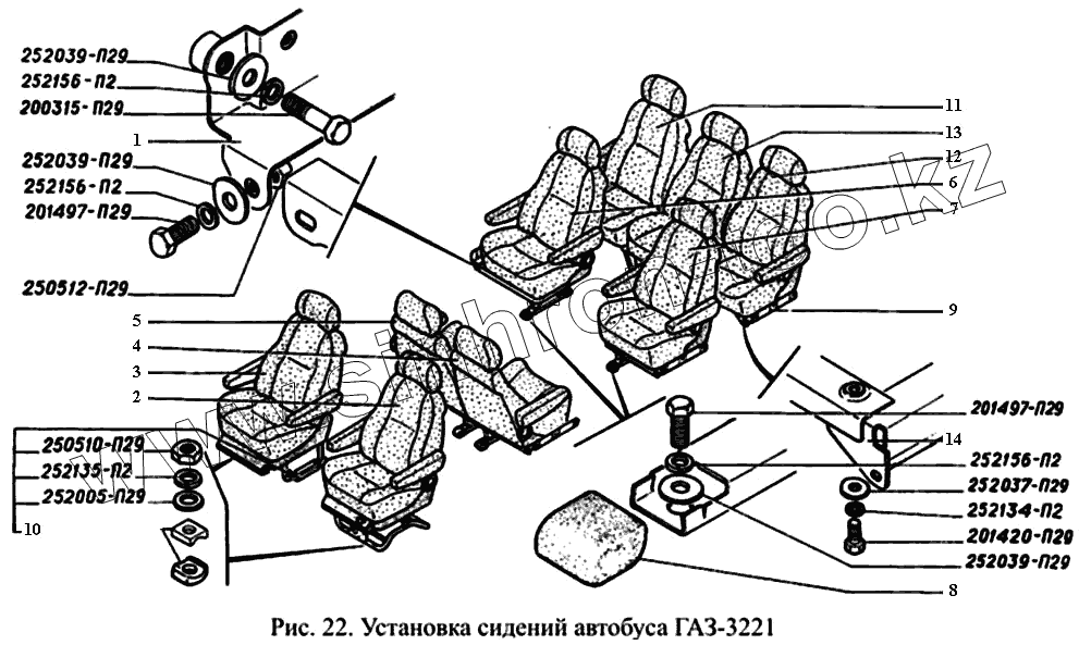 Каталог запасных частей к технике: ГАЗ-3221. Установка сидений автобуса ГАЗ-3221