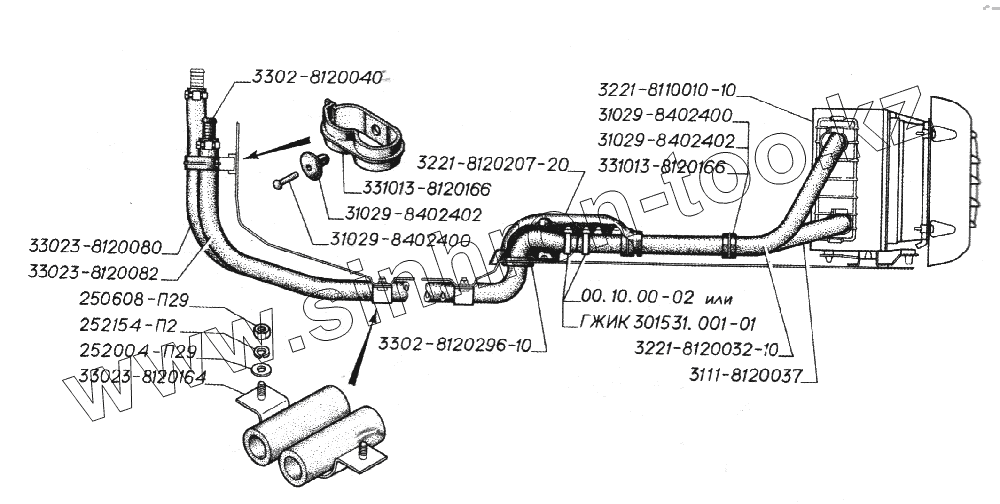 Каталог запасных частей к технике: ГАЗ-3221 (2006). Трубопроводы заднего отопителя автобусов