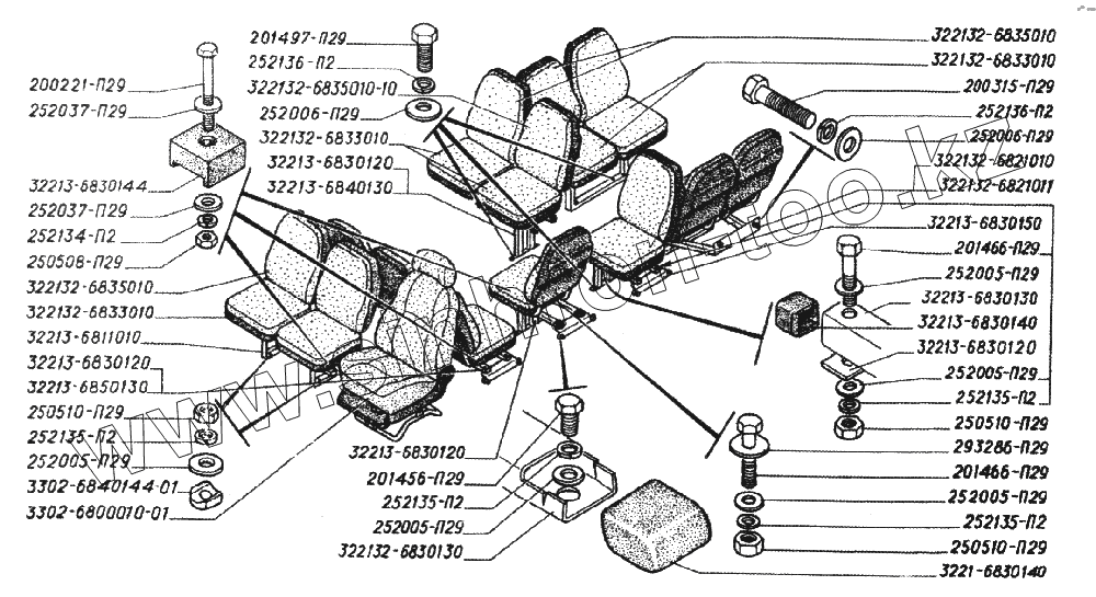 Каталог запасных частей к технике: ГАЗ-3221 (2006). Установка сидений автобуса-такси ГАЗ-322132