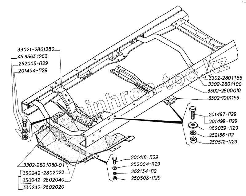 Каталог запасных частей к технике: ГАЗ-3302 (2004). Рама, поперечины крепления двигателя, брызговик двигателя
