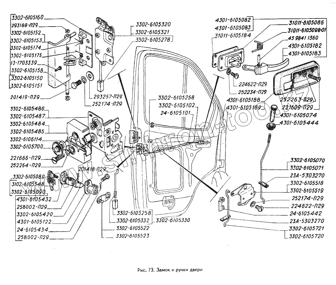 Каталог запасных частей к технике: ГАЗ-3302 (ГАЗель). Замок и ручки двери