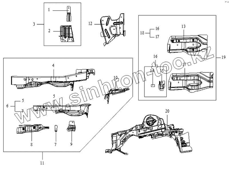 Каталог запасных частей к технике: Geely CK. LF SPLASH GUARD & FRT SIDE RAIL ASSY