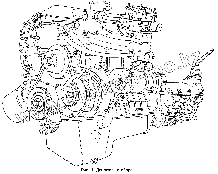Двигатель с оборудованием и коробкой передач в сборе (с карбюратором 2140 и термостатом ТС 103)