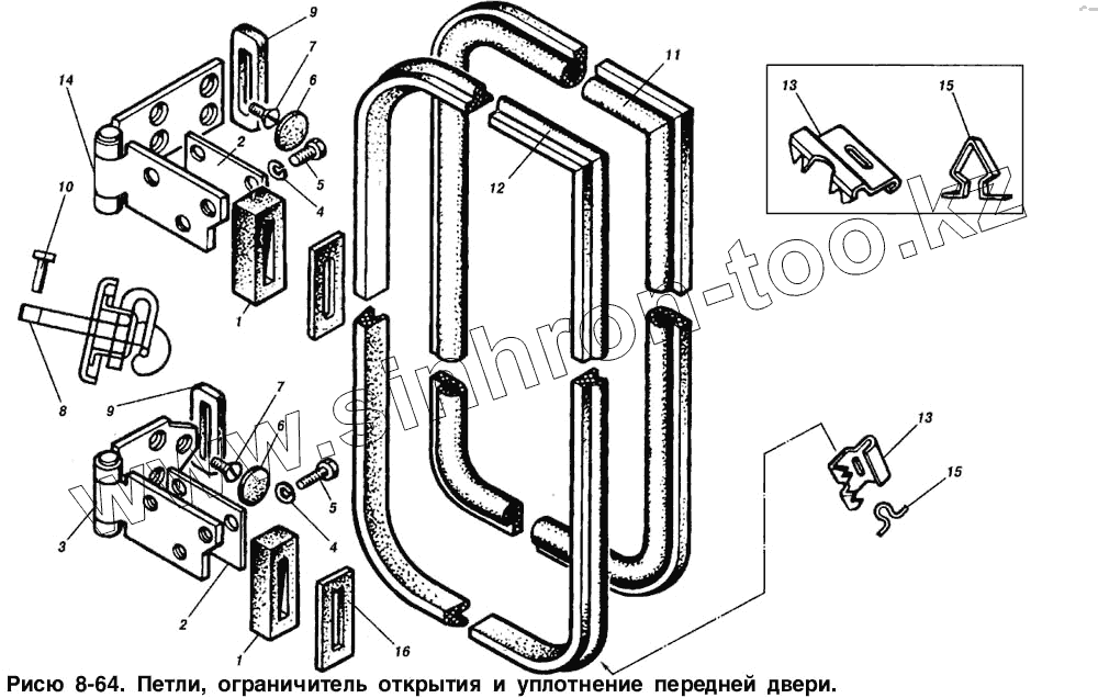 Каталог запасных частей к технике: ИЖ 2715. Петли, ограничитель открытия и уплотнение передней двери