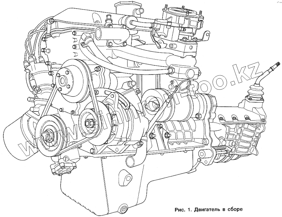 Двигатель с оборудованием и коробкой передач в сборе (с карбюратором 2140 и термостатом ТС 103)