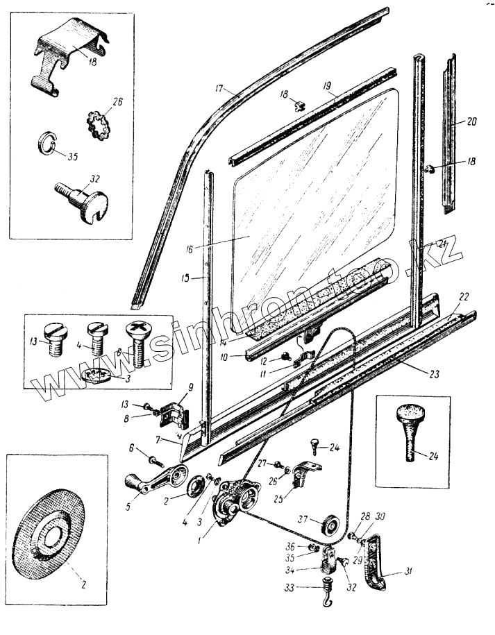 Каталог запасных частей к технике: ИЖ 412. Опускное стекло и стеклоподъемник передней двери