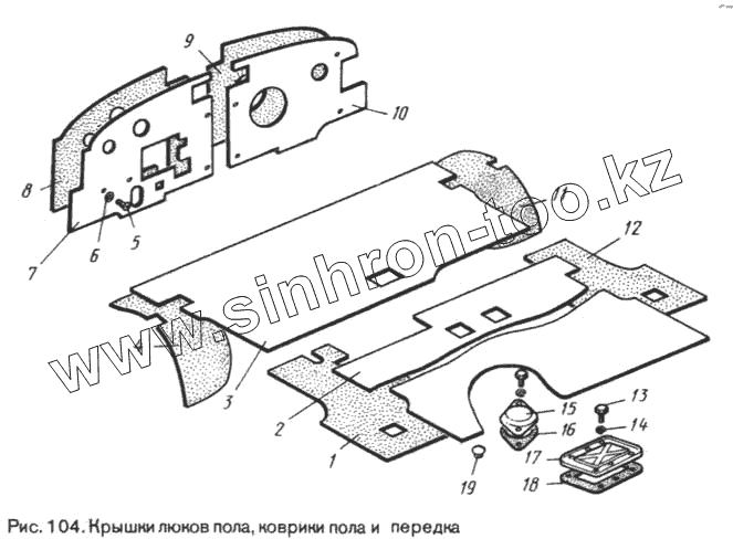 Каталог запасных частей к технике: ЛуАЗ 969М. Крышки люков пола, коврики пола и передача