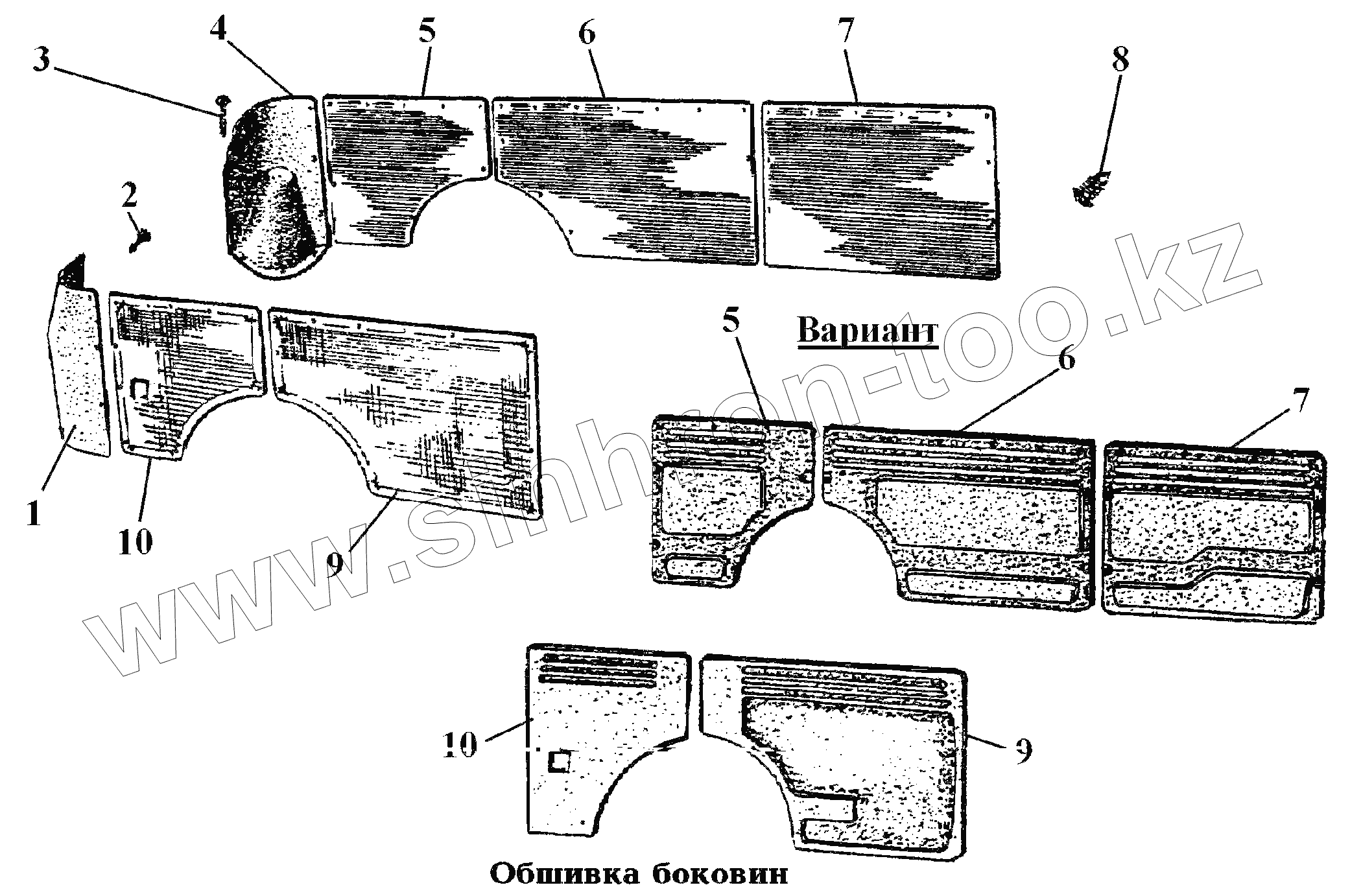 Каталог запасных частей к технике: РАФ-22038-2. 500. Кузов\Обивка боковин