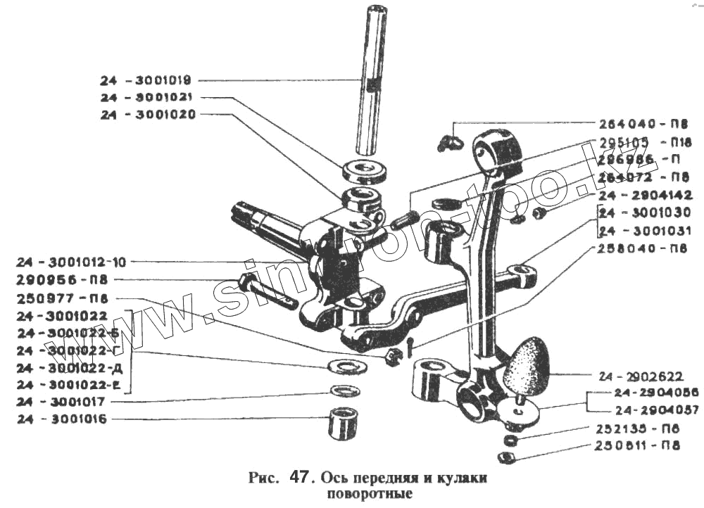 Каталог запасных частей к технике: РАФ-2203. Ось передняя и кулаки поворотные