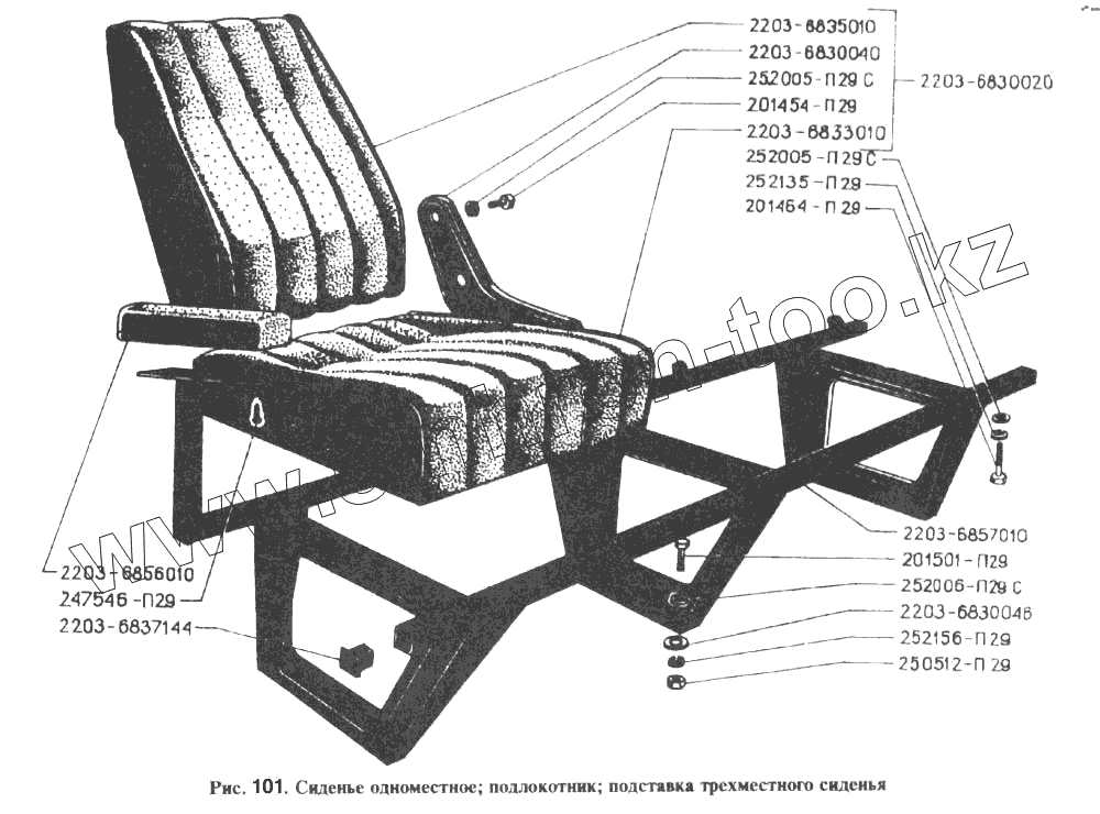 Каталог запасных частей к технике: РАФ-2203. Сиденье одноместное, подлокотник, подставка трехместного сиденья