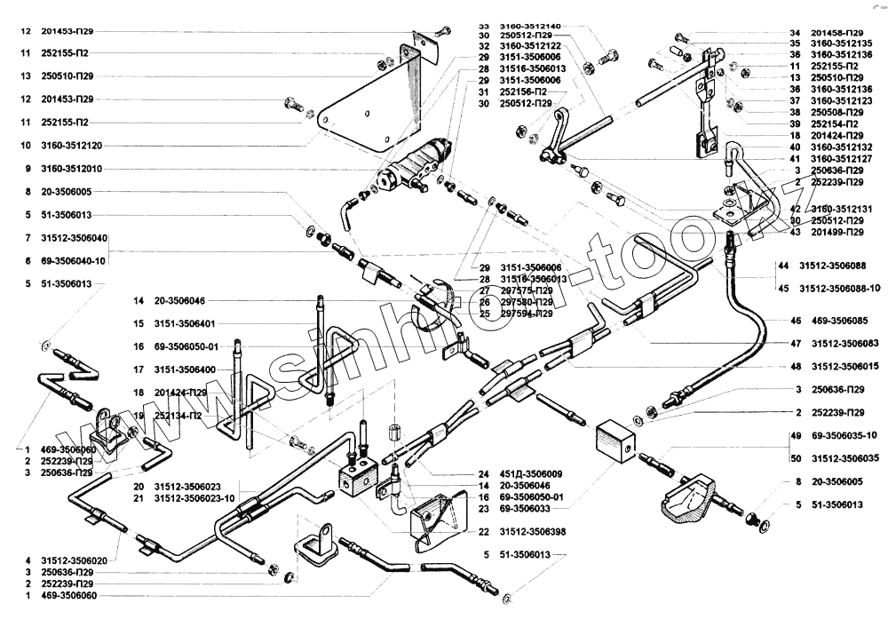 | 50 | 31512-3506035 | Трубка от тройника к левому заднему гидравлическому тормозу в сборе |