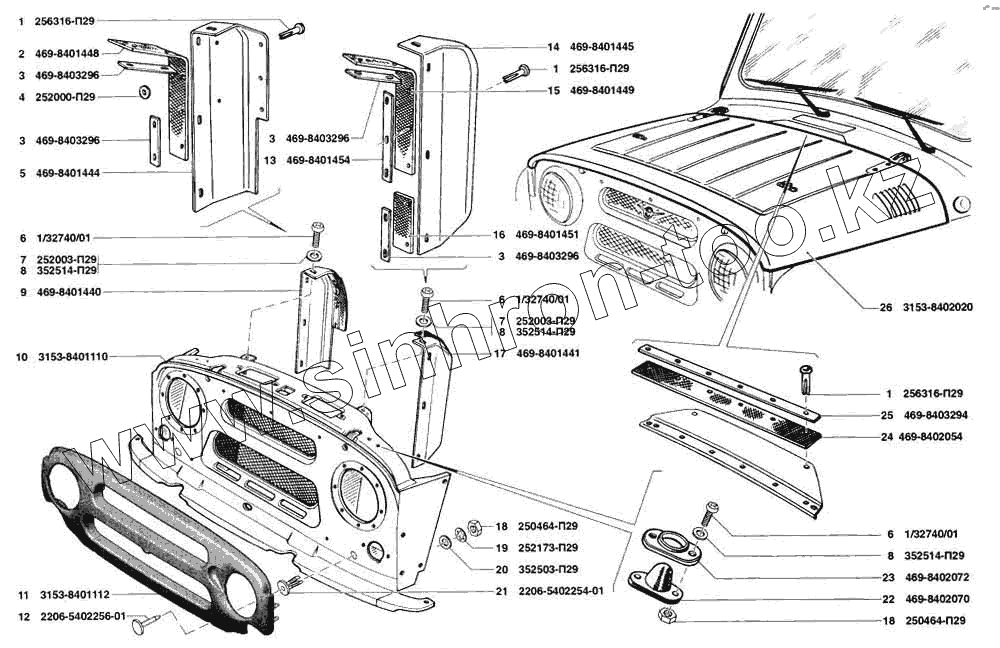Каталог запасных частей к технике: УАЗ-31519. Капот, облицовка радиатора