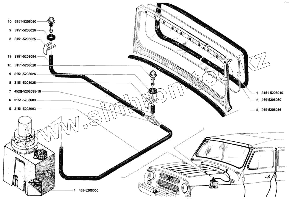 Каталог запасных частей к технике: УАЗ-31519. Окно ветровое, смыватель