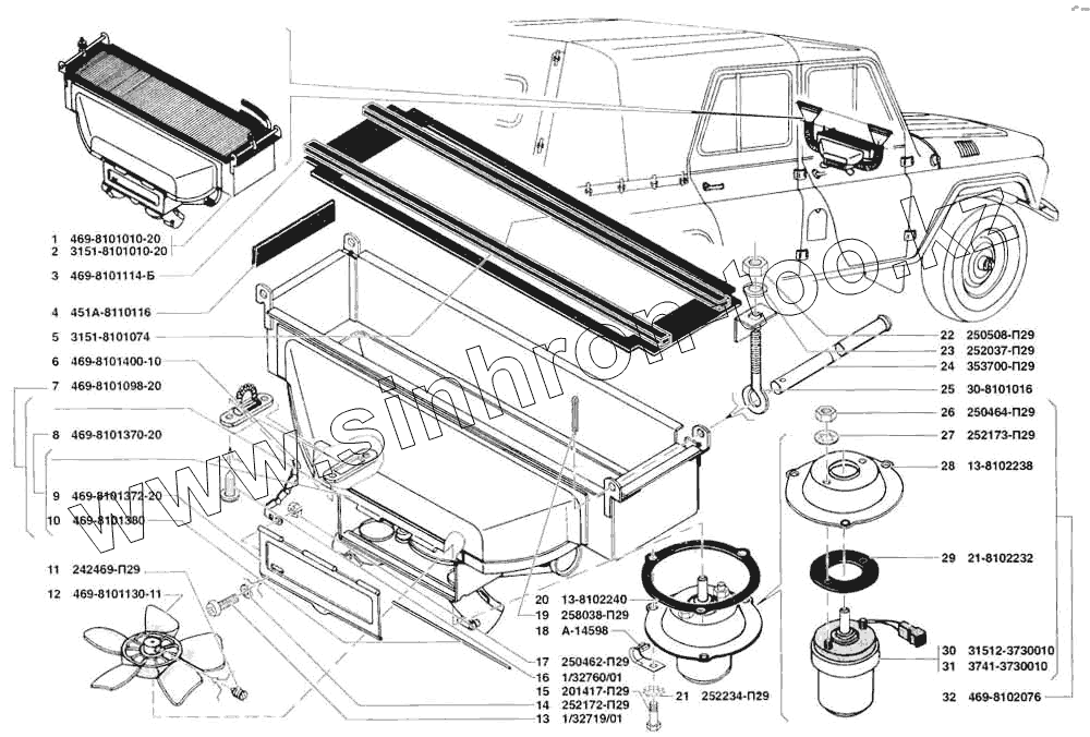 Каталог запасных частей к технике: УАЗ-31519. Отопление кузова и трубопроводы