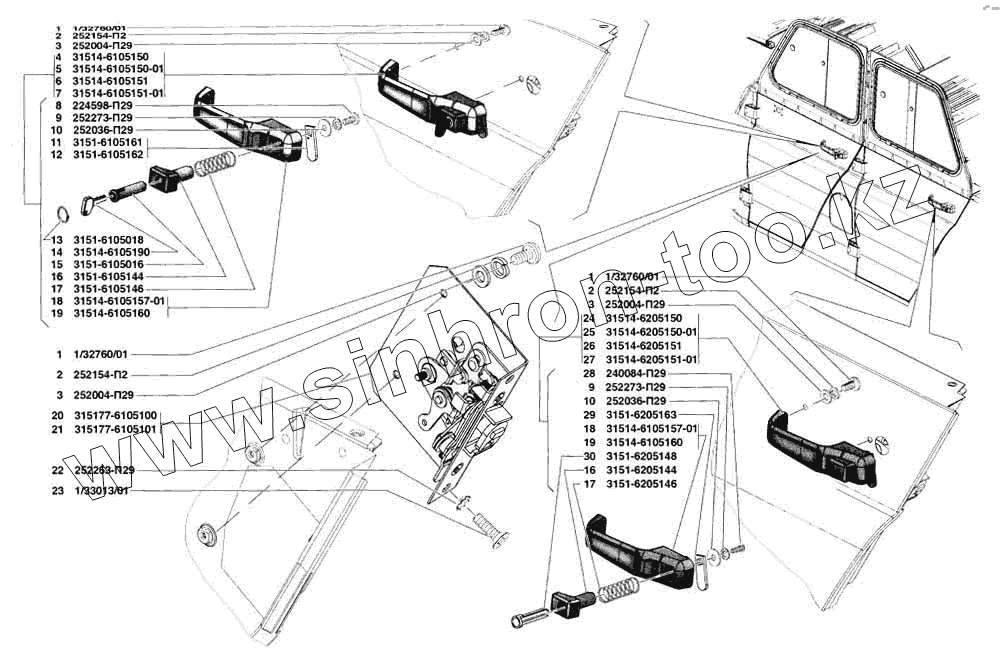 Каталог запасных частей к технике: УАЗ-31519. Замок и ручки передней и задней дверей