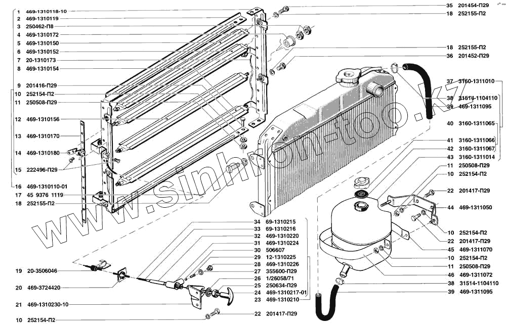 Каталог запасных частей к технике: УАЗ-31519. Жалюзи радиатора и привод, бачок расширительный