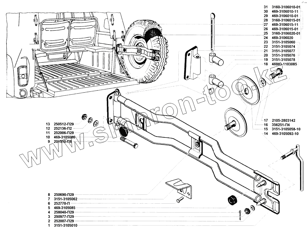 Каталог запасных частей к технике: УАЗ-31519. Держатель запасного колеса, покрышки и камеры