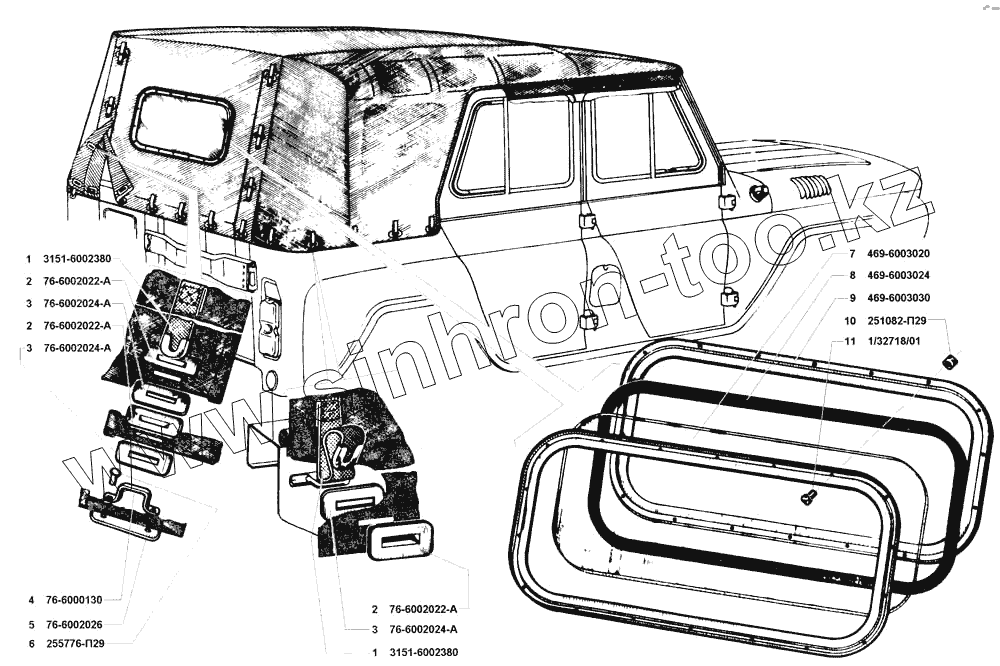 Каталог запасных частей к технике: УАЗ-31519. Детали тента, окно тента