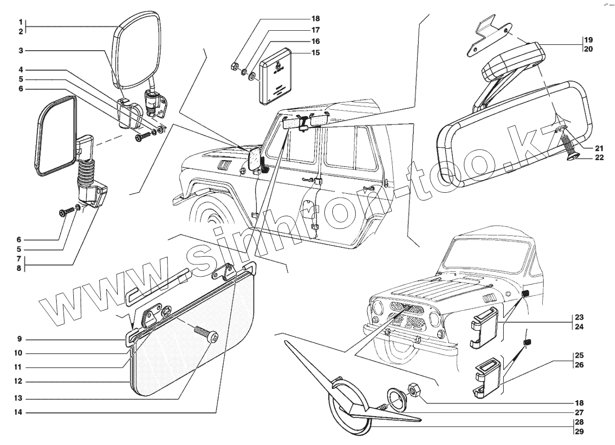 Каталог запасных частей к технике: УАЗ-31519. Зеркала, козырек противосолнечный, отражатели света, орнаменты