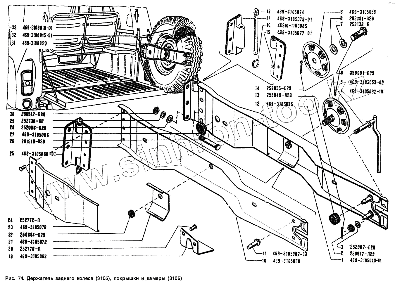 Каталог запасных частей к технике: УАЗ-3151. Держатель запасного колеса, покрышки и камеры